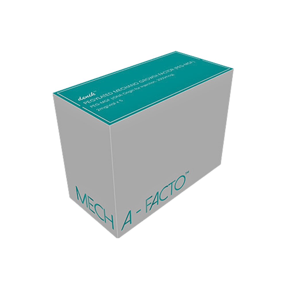 MECHA-FACTO by Denik Pharma contains PEG-MGF (IGF-1Ec), a polyethylene glycol-modified form of Mechano Growth Factor (MGF), which itself is a variant of Insulin-Like Growth Factor-1 (IGF-1) known for its role in muscle repair and growth signaling.